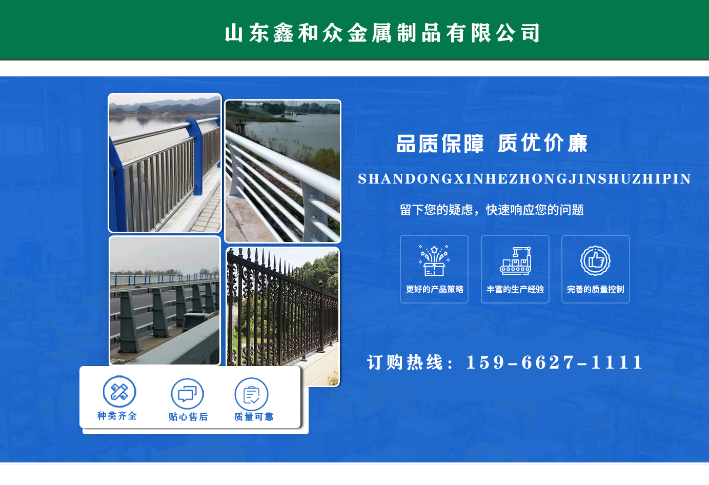 山東鑫和眾金屬制品有限公司主要產(chǎn)品有防撞護(hù)欄,橋梁護(hù)欄,道路護(hù)欄,河道護(hù)欄,不銹鋼護(hù)欄等護(hù)欄。提供設(shè)計(jì)方案,一站式定制,包您滿意價格優(yōu)惠,歡迎來電咨詢!    公司常年從事銷售護(hù)欄防撞護(hù)欄,橋梁護(hù)欄,道路護(hù)欄,河道護(hù)欄,不銹鋼護(hù)欄,橋梁鋼護(hù)欄,河道燈光護(hù)欄等。產(chǎn)品廣泛應(yīng)用于橋梁、河道、旅游景區(qū)、道路、公路、公園、小區(qū)、景觀、道路防撞等領(lǐng)域。    公司產(chǎn)品均采用優(yōu)質(zhì)不銹鋼材料,符合相關(guān)標(biāo)準(zhǔn)。各種型號不銹鋼復(fù)合管及護(hù)欄,質(zhì)量嚴(yán)格把控。產(chǎn)品強(qiáng)度高、耐腐蝕、焊接牢固、抗沖擊、性能好,防撞護(hù)欄結(jié)構(gòu)簡單、美觀實(shí)用大方。     歡迎前來訂購!...